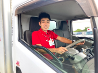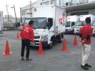 - 安全運転実地訓練では、トラックの構造と死角、内輪差の把握、後退訓練を重点的に行います。営業所に入って4週間のOJT訓練、常にトレーナーがついて安全運転や配達業務のトレーニングを行います。最後に卒業検定を受けて、やっと一人立ちです。
